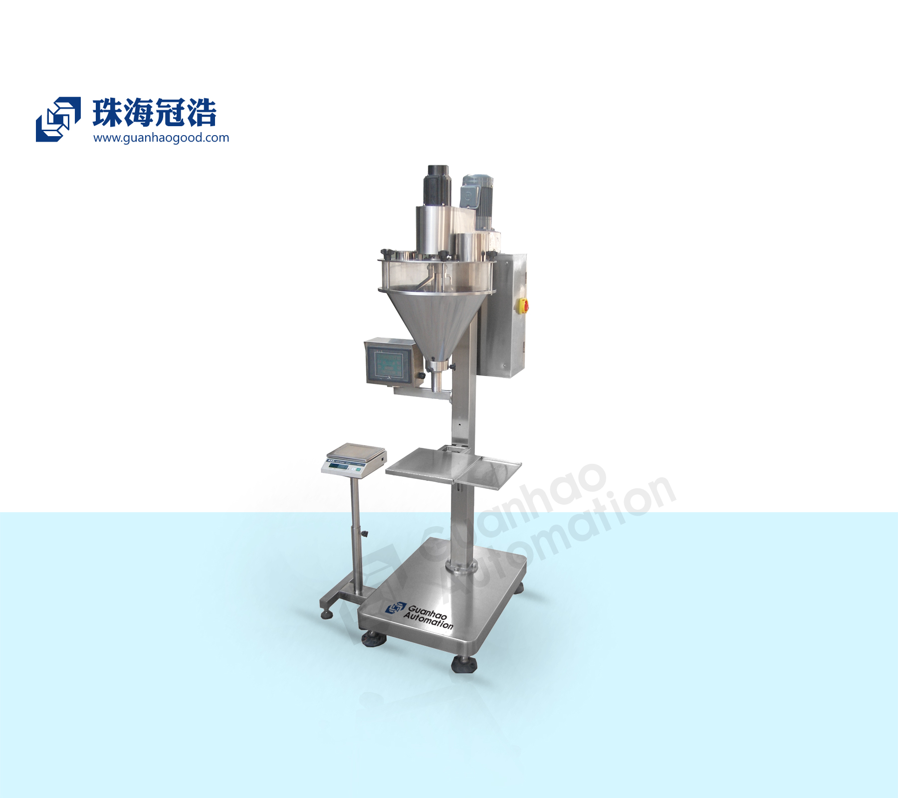 珠海冠浩機械-GH—LA2半自動充填包裝機主要由充填主機、電器配電箱、觸摸屏PLC及電子秤組成。